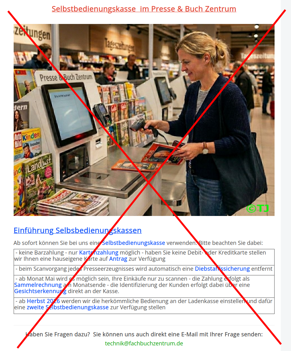- ab Herbst 2026 werden wir die herkömmliche Bedienung an der Ladenkasse einstellen und dafür eine zweite Selbstbedienungskasse zur Verfügung stellen |